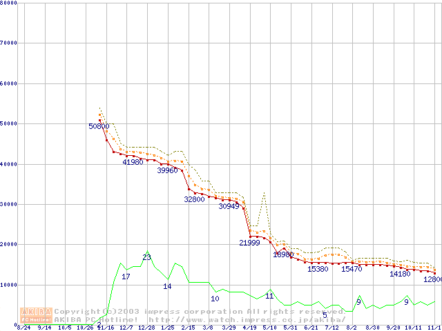 Socket A (OPGA,FSB 333MHz,L2 256KB,Thoroughbred)の最安値推移