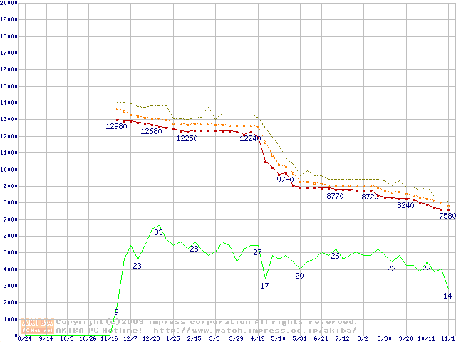 Socket 478 (micro-PGA,FSB 400MHz,L2 128KB,Northwood)の最安値推移
