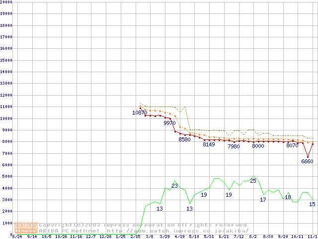 Socket A (OPGA,FSB 266MHz,L2 256KB,Thoroughbred)の最安値推移