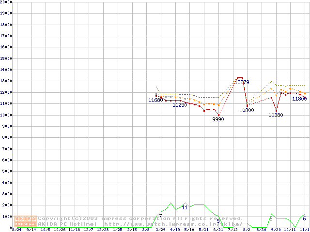 MHT20x0ATシリーズ (9.5mm,4200rpm,UltraATA/100,2MB,FDB,40GB/Platter,FDB)の最安値推移