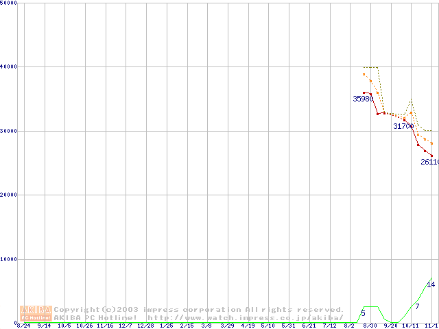 Travelstar 5K80 (9.5mm,5400rpm,UltraATA/100,8MB,FDB,40GB/Platter)の最安値推移