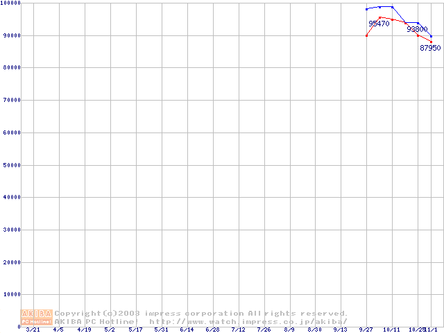 | [↑前グラフ]: | Socket 754 (PGA,FSB 800MHz,L2 1MB,ClawHammer)の最安値推移 |