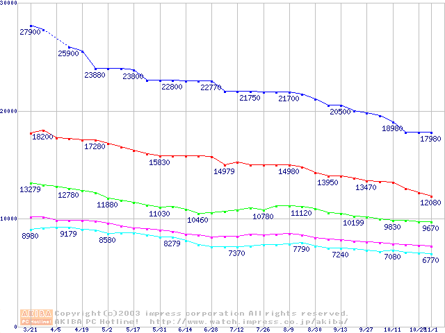 | [↑前グラフ]: | DiamondMax Plus 9 (7200rpm,8MB,UltraATA/133,FDB)の最安値推移 |