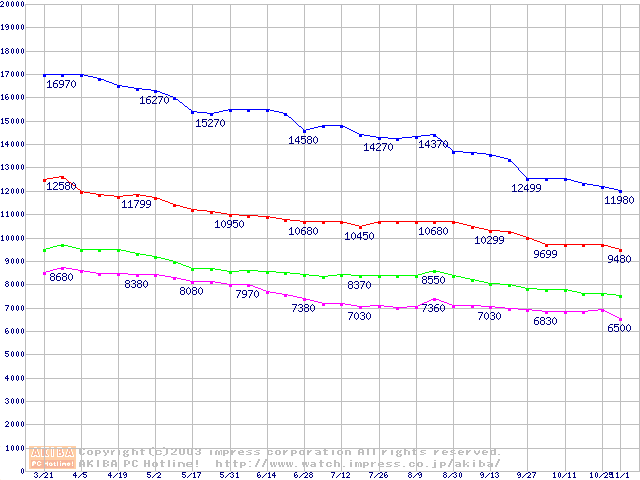 | [↑前グラフ]: | MaXLine II (5400rpm,UltraATA/133,2MB,80GB/Platter,BB)の最安値推移 |