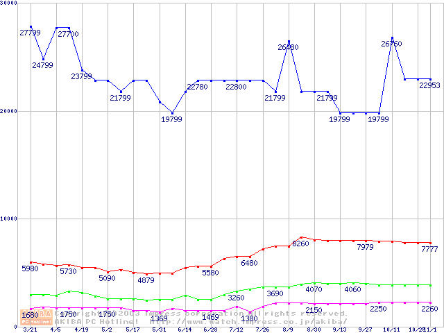 | [↓次グラフ]: | PC2100(DDR266) DDR SDRAM DIMM(CL 2.0)の最安値推移 |