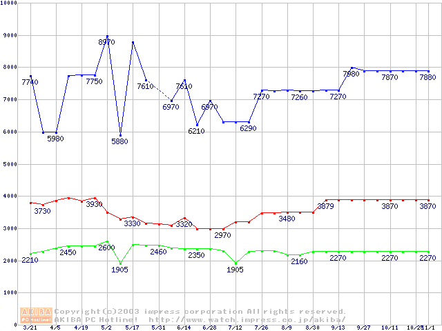 | [↓次グラフ]: | PC800-40 DRDRAM RIMMの最安値推移 |