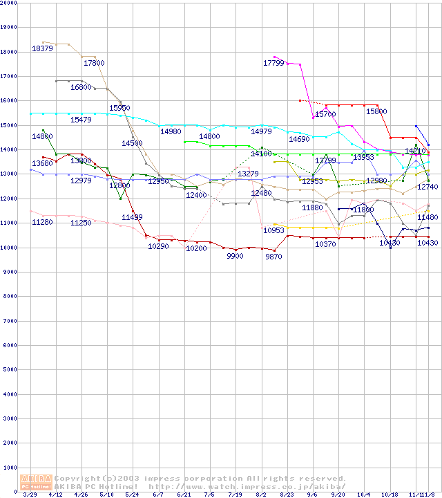 2.5インチHDD主要製品(最安値1万5千円~2万円未満)の最安値推移