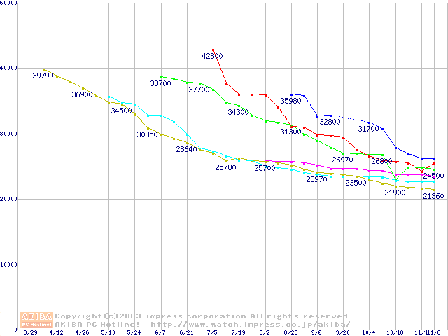 | [↓次グラフ]: | 2.5インチHDD 20GB~40GB未満(9.5mm厚)の最安値推移 |