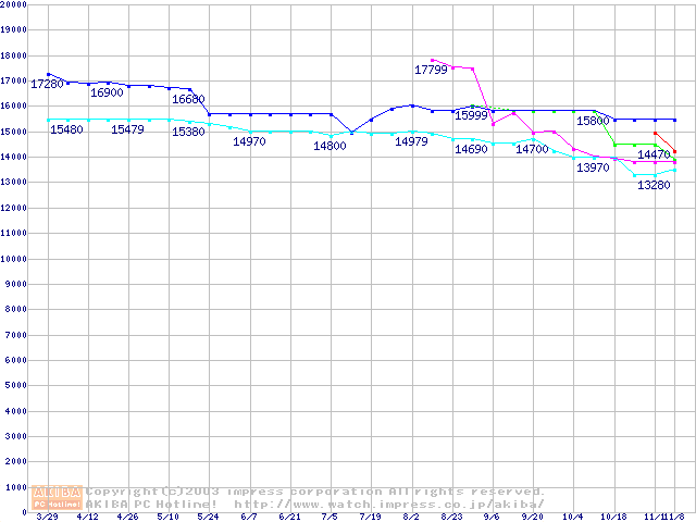 | [↑前グラフ]: | 2.5インチHDD 40GB~50GB未満(9.5mm厚,4200rpm)の最安値推移 |