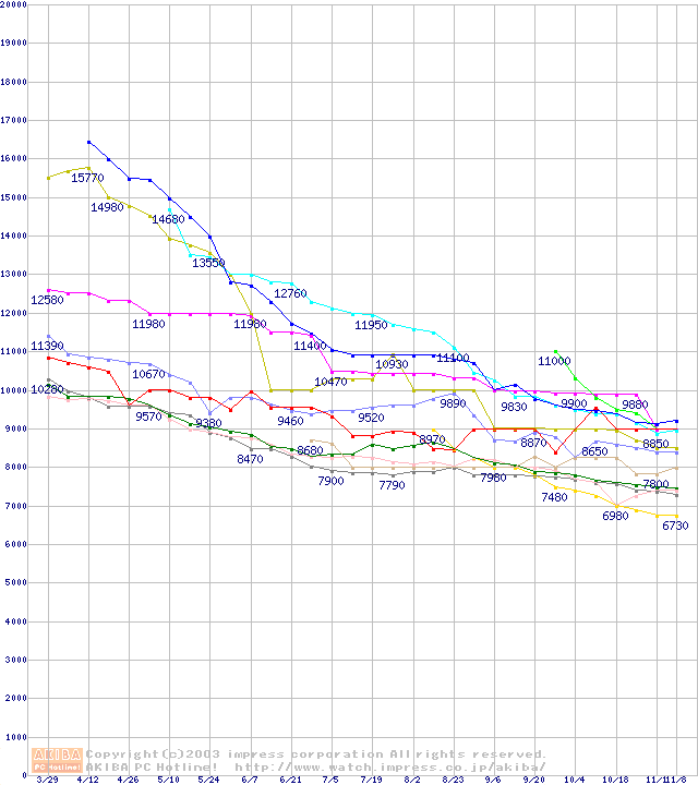 HDD 100~160GB未満(7200rpmクラス)の最安値推移