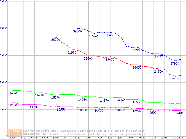 | [↓次グラフ]: | HDD 30GB~80GB未満(7200rpmクラス)の最安値推移 |