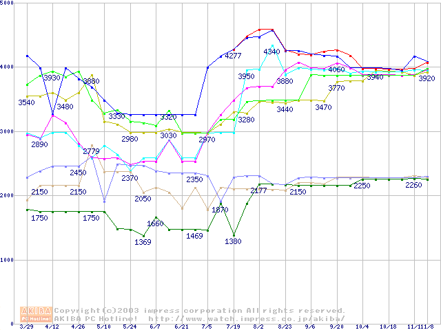 メモリ主要製品(最安値5千円未満)の最安値推移