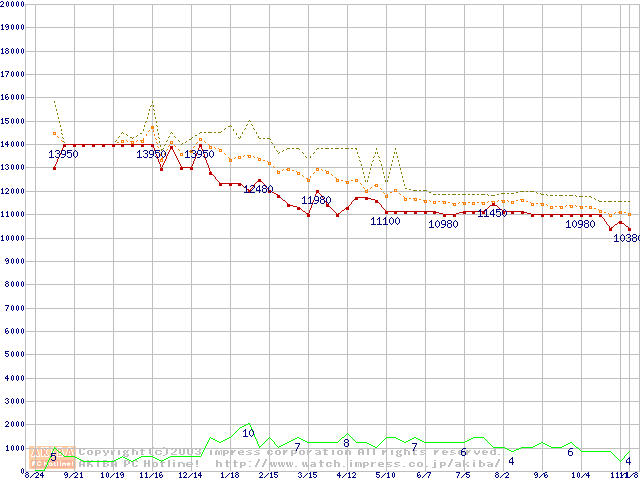 Socket 370 (FC-PGA,FSB 133MHz,L2 256KB,Coppermine)の最安値推移
