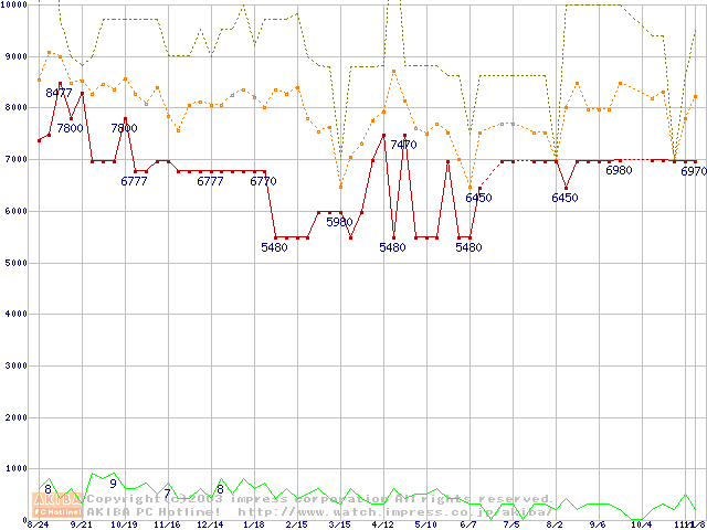 PC133 SDRAM DIMM CasLatency=3 ECC対応 Registeredタイプの最安値推移