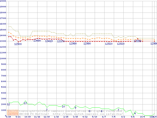 Socket 370 (FC-PGA2,FSB 133MHz,L2 256KB,Tualatin)の最安値推移