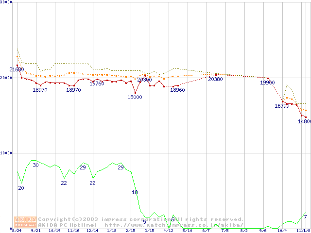 Socket 478 (micro-PGA,FSB 400MHz,L2 512KB,Northwood)の最安値推移