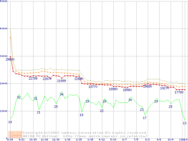 Socket 478 (micro-PGA,FSB 533MHz,L2 512KB,Northwood)の最安値推移