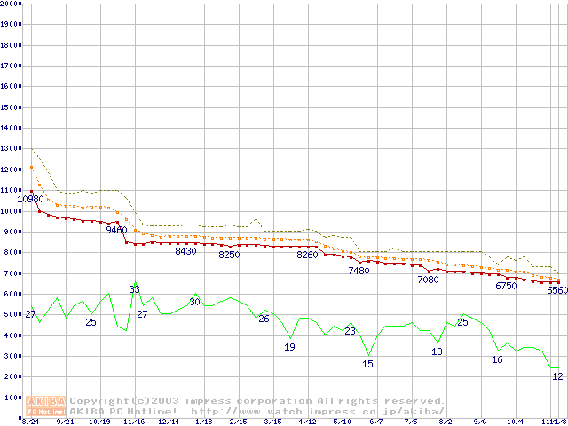 Socket 478 (micro-PGA,FSB 400MHz,L2 128KB,Willamette)の最安値推移