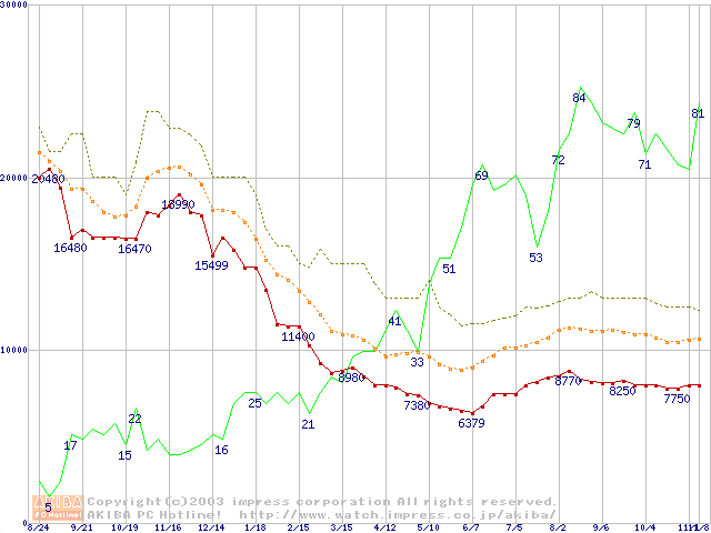 PC3200(DDR400) DDR SDRAM DIMMの最安値推移
