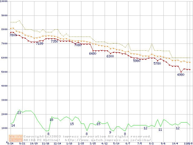 HDD 20GB~30GB未満(5400rpmクラス)の最安値推移