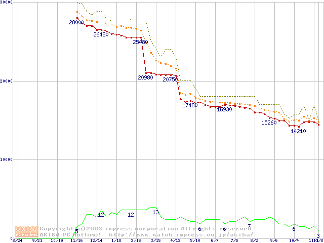 Socket A (OPGA,FSB 266MHz,L2 256KB,Thoroughbred)の最安値推移