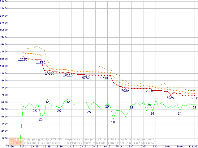 Socket 478 (micro-PGA,FSB 400MHz,L2 128KB,Northwood)の最安値推移