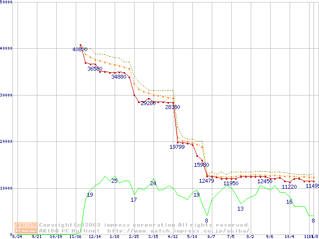 Socket A (OPGA,FSB 333MHz,L2 256KB,Thoroughbred)の最安値推移