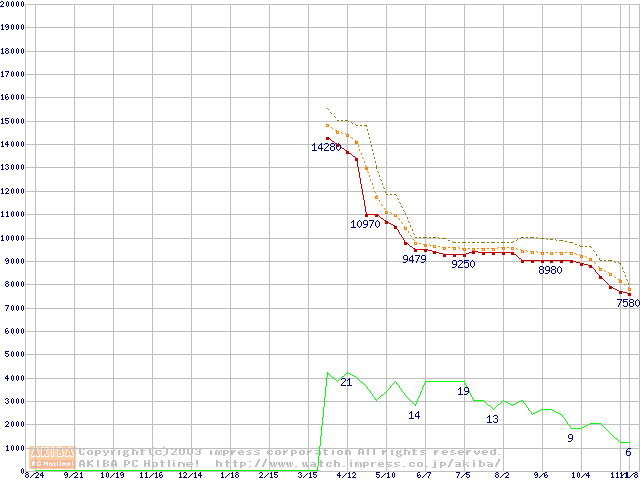 Socket 478 (micro-PGA,FSB 400MHz,L2 128KB,Northwood)の最安値推移