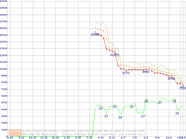 Socket 478 (micro-PGA,FSB 400MHz,L2 128KB,Northwood)の最安値推移