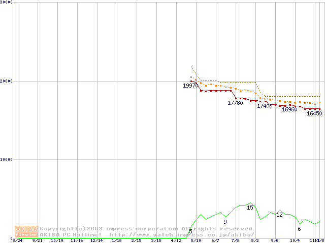 MHT20x0ATシリーズ (9.5mm,4200rpm,UltraATA/100,2MB,FDB,40GB/Platter,FDB)の最安値推移