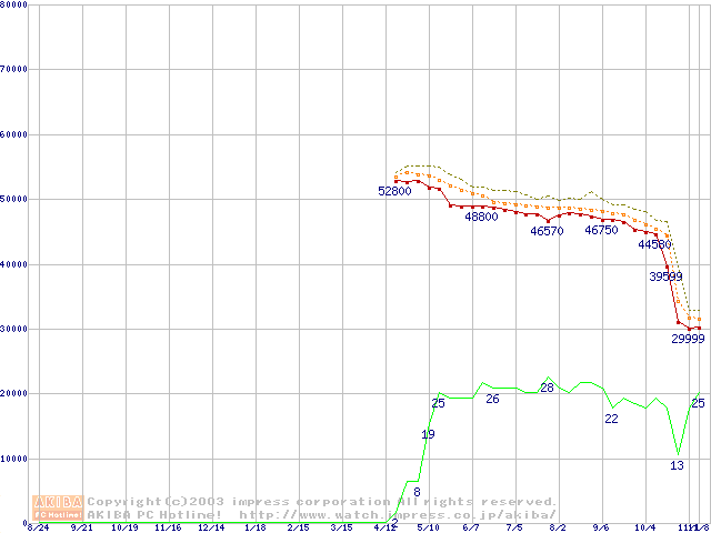 Socket 478 (micro-PGA,FSB 800MHz,L2 512KB,Hyper-Threading,Northwood)の最安値推移
