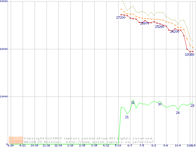 Socket 478 (micro-PGA,FSB 800MHz,L2 512KB,Hyper-Threading,Northwood)の最安値推移