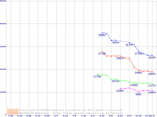 | [↑前グラフ]: | Travelstar 7K60 (9.5mm,7200rpm,UltraATA/100,8MB,FDB,30GB/Platter)の最安値推移 |