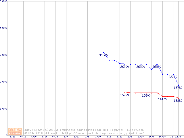 | [↑前グラフ]: | Travelstar 40GNX (9.5mm,5400rpm,UltraATA/100,8MB,FDB,20GB/Platter)の最安値推移 |