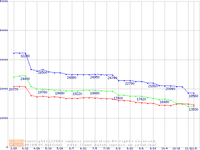 | Socket A (OPGA,FSB 266MHz,L2 256KB,Thoroughbred)の最安値推移 |