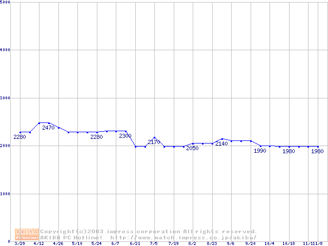 | [↑前グラフ]: | Socket A (OPGA,FSB 266MHz,L2 64KB,Applebred)の最安値推移 |