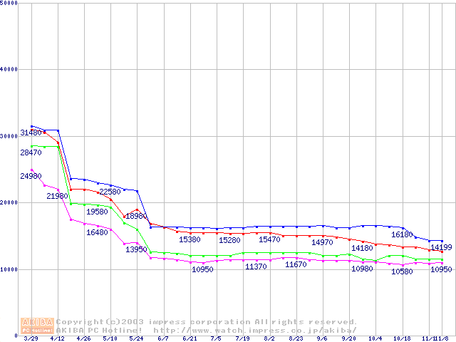 | [↓次グラフ]: | Socket A (OPGA,FSB 266MHz,L2 256KB,Thoroughbred)の最安値推移 |