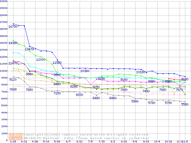 | [↓次グラフ]: | Socket A (OPGA,FSB 266MHz,L2 512KB,Barton)の最安値推移 |