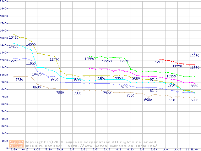 | [↑前グラフ]: | Socket 603 (micro-PGA,FSB 400MHz,L2 512KB,Prestonia)の最安値推移 |