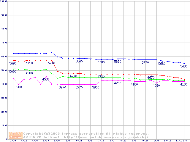 | [↑前グラフ]: | Socket 370 (FC-PGA,FSB 133MHz,L2 256KB,Coppermine)の最安値推移 |