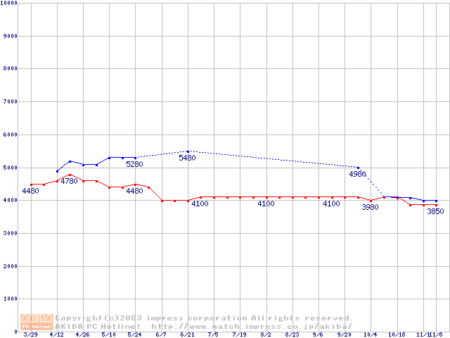 | [↑前グラフ]: | Socket 370 (FC-PGA2,FSB 100MHz,L2 256KB,Tualatin)の最安値推移 |
