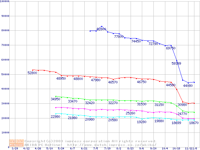 | [↓次グラフ]: | Socket 478 (micro-PGA,FSB 533MHz,L2 512KB,Hyper-Threading,Northwood)の最安値推移 |