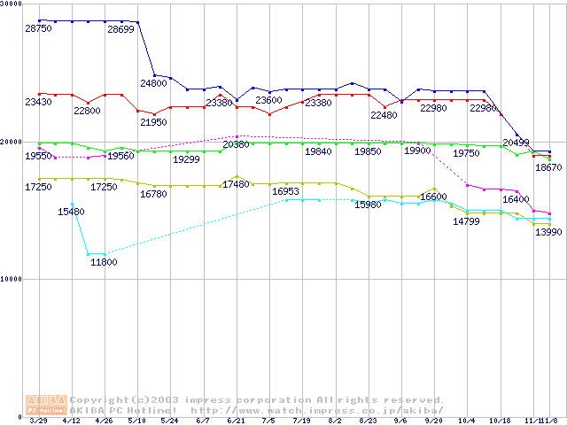 | [↑前グラフ]: | Socket 478 (micro-PGA,FSB 533MHz,L2 512KB,Northwood)の最安値推移 |