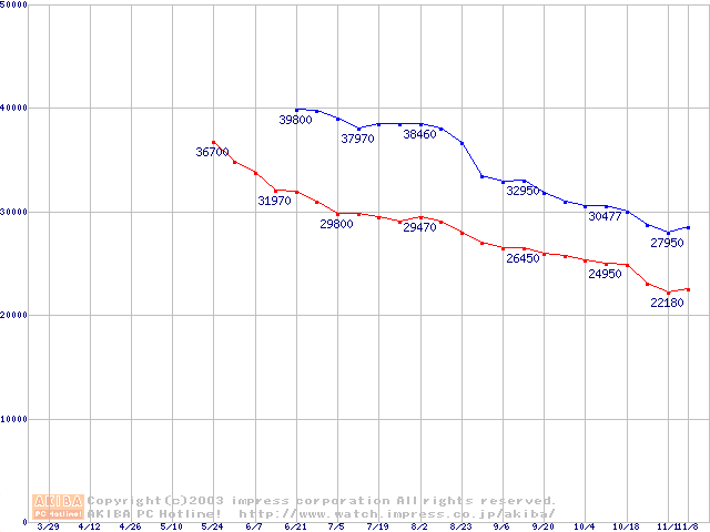 | [↑前グラフ]: | DiamondMax Plus 8 (7200rpm,2MB,UltraATA/133,FDB)の最安値推移 |