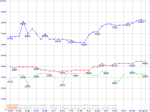 | [↑前グラフ]: | PC133 SDRAM DIMM CasLatency=3の最安値推移 |