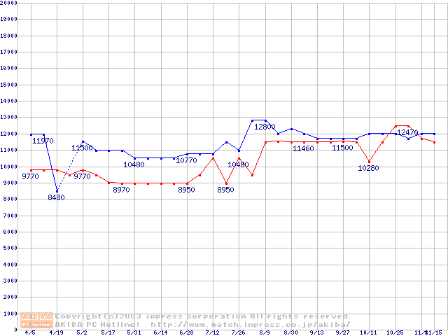 メモリ主要製品(最安値1万円以上)の最安値推移