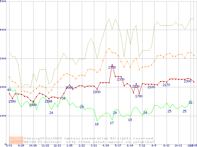 PC133 SDRAM DIMM CasLatency=3の最安値推移