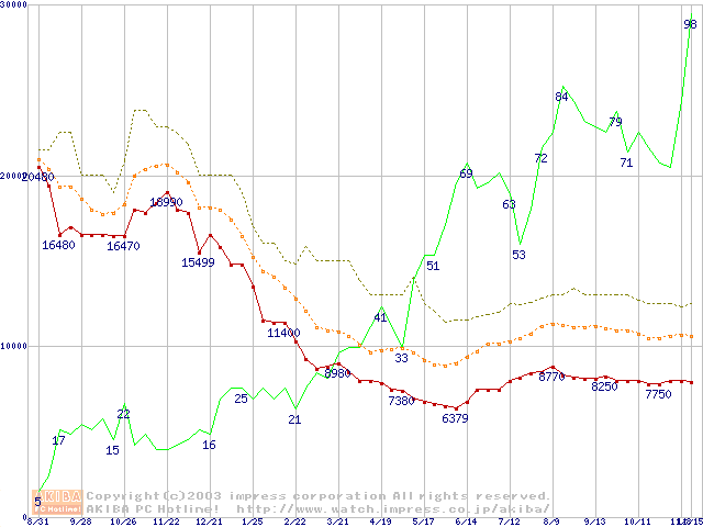 PC3200(DDR400) DDR SDRAM DIMMの最安値推移