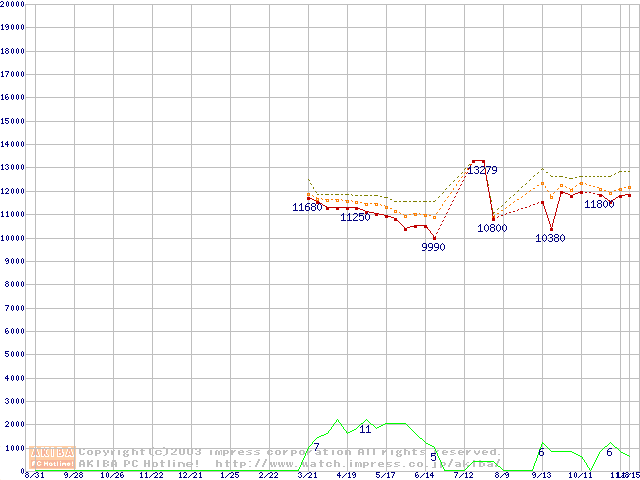 MHT20x0ATシリーズ (9.5mm,4200rpm,UltraATA/100,2MB,FDB,40GB/Platter,FDB)の最安値推移