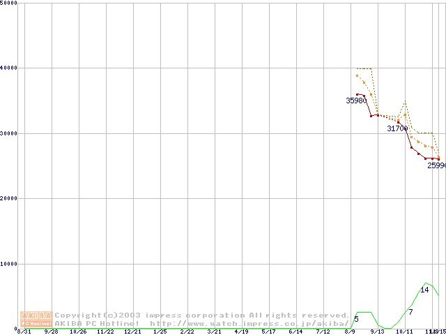 Travelstar 5K80 (9.5mm,5400rpm,UltraATA/100,8MB,FDB,40GB/Platter)の最安値推移